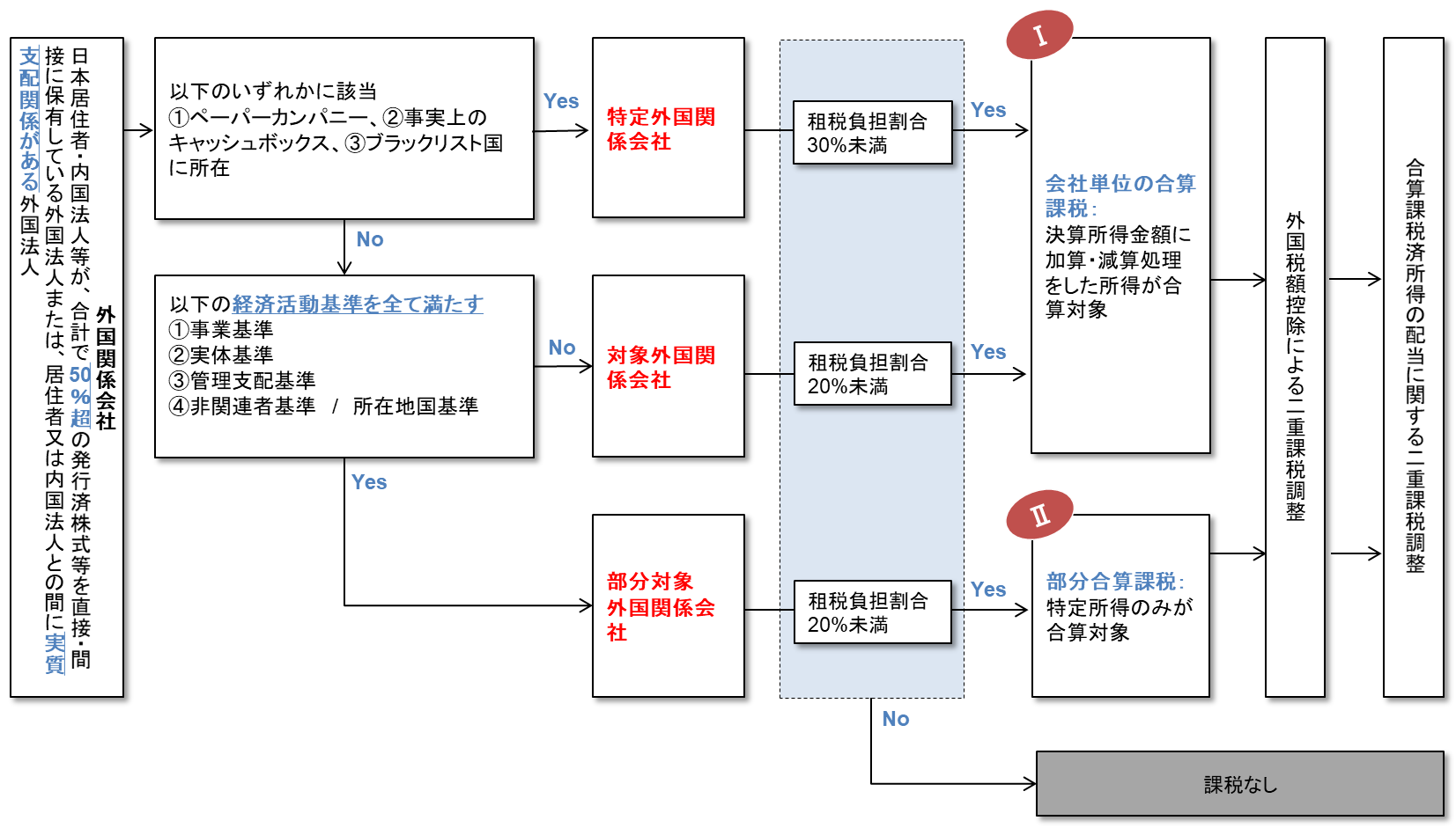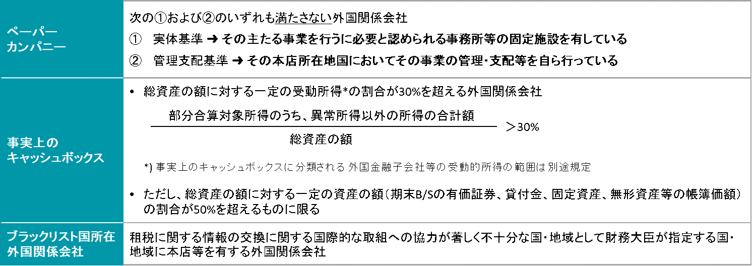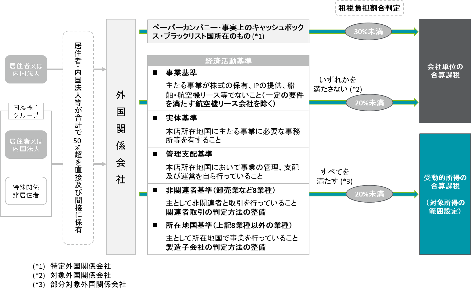 これらのうちいずれかを満たさない外国関係会社を対象外国関係会社(特定外国関係会社に該当するものを除く)と定義し、能動的所得を得る上で必要な経済活動の実体を備えていないと判断され、会社単位の合算課税の対象となります。