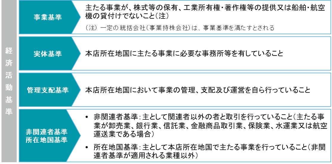 『経済活動基準』は、①事業基準、②実体基準、③管理支配基準及び④非関連者基準/所在地国基準があります。
